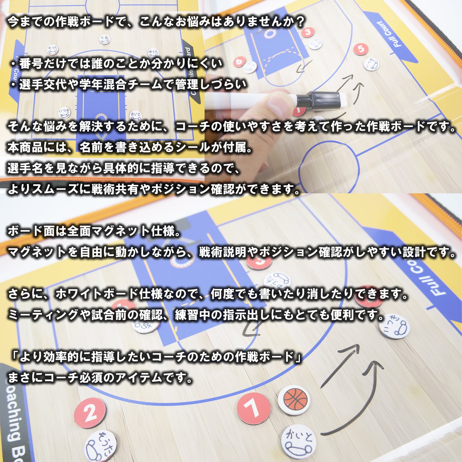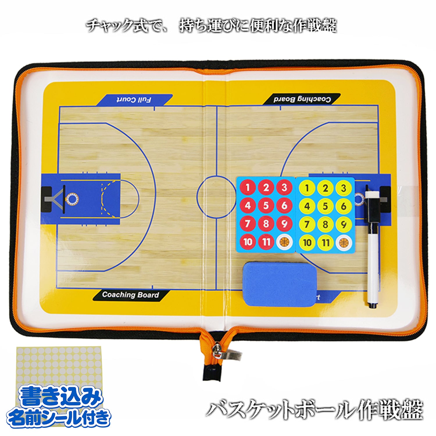 バスケットボール チャック式 作戦盤 【名前シール付き】 バスケ 折りたたみ タクティクスボード コーチングボード 作戦ボード マグネット ペン フォーメーション ポディションチェック タクティックボード 練習 動き 解説 説明 バスケット用品