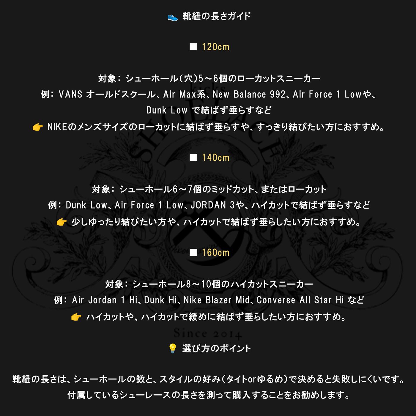 スニーカー自体のサイズや、通す際の緩ませ具合で、紐の長さは変わりますが、ご参考までに。